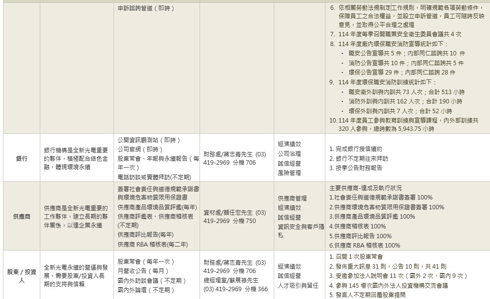 二、114年度各利害關係人溝通情形於115年1月30日向董事會報告。最近年度各類別利害關係人溝通情形與報告內容如下: