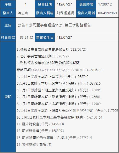 公告本公司114年第二季財務報告董事會預計召開日期為114年7月24日 |